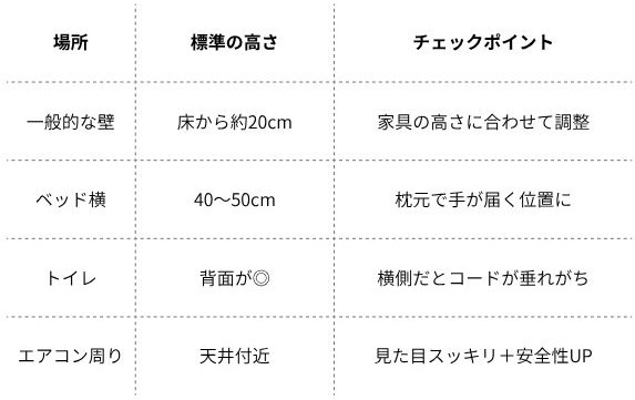 ⇒最低でも4〜6口は想定しておきましょう。見た目をスッキリさせたい場合は壁面裏配線もおすすめ。
