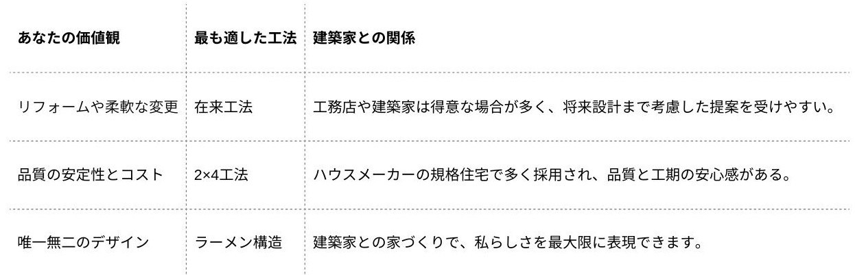 構造選びの「正解」は、あなたのこだわりたいポイントによって変わります。単なる構造の違いだけでなく、資産価値や暮らし方にどう影響するかを考えましょう。