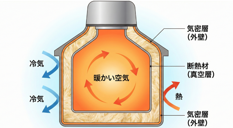 これを衣服に例えるなら、「極厚のダウンジャケット(断熱)」を着込み、さらにその上から「防風のウィンドブレーカー(気密)」を羽織るようなものです。